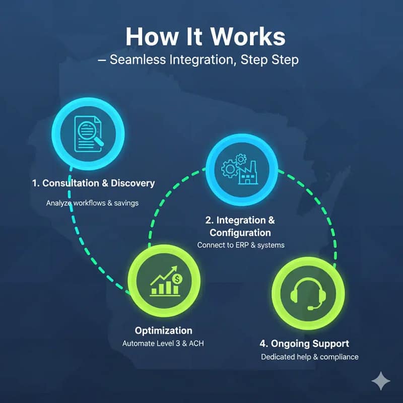 We conduct a thorough analysis of your manufacturing billing cycles, current transaction volume, and your specific ERP System Integration needs. We identify where Level 3 Data Processing can deliver the biggest savings.